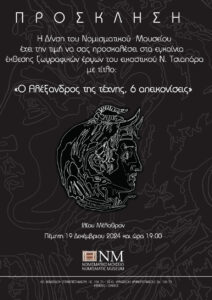 Το Νομισματικό Μουσείο διοργανώνει περιοδική έκθεση με θέμα: Ο Αλέξανδρος της Τέχνης, 6 απεικονίσεις, η οποία θα παρουσιαστεί στην αίθουσα «Χρήμα και Κοινωνία» στο Β΄ όροφο του Ιλίου Μελάθρου και θα διαρκέσει από τις 19 Δεκεμβρίου 2024 μέχρι τις 25 Φεβρουαρίου 2025. Πρόκειται για έναν γόνιμο εικαστικό διάλογο ανάμεσα σε αρχαία νομίσματα που απεικονίζουν τη μορφή του Αλέξανδρου ως νέου αγένειου άνδρα με ωραία χαρακτηριστικά αλλά ταυτόχρονα με το δυναμικό και αγέρωχο ύφος του στρατηλάτη. Ιχνηλατώντας με ιδιαίτερη ευαισθησία αυτά τα πολιτισμικά κοιτάσματα, ο εικαστικός Ν. Τσιαπάρας εμπνέεται απ’ αυτά, σπάει τις φόρμες και ταυτόχρονα τις γονιμοποιεί δημιουργώντας έξι πρωτότυπα ζωγραφικά έργα τέχνης.