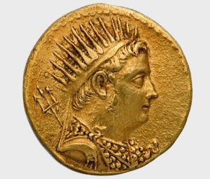 Ο Πτολεμαίος Γ΄ Ευεργέτης μετά το θάνατό του, απεικονίζεται με θεϊκά χαρακτηριστικά, όπως την αιγίδα του Διός και την τρίαινα του Ποσειδώνος, για να προβληθεί η ισχύς της δυναστείας των Πτολεμαίων. Πτολεμαίος Δ΄, χρυσό οκτάδραχμο, 222-205 π.Χ. Νομισματικό Μουσείο, Συλ. Δημητρίου.