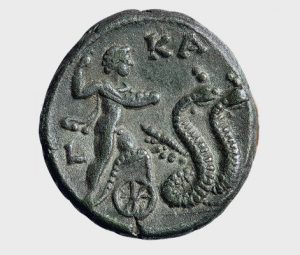 Ο ήρωας Τριπτόλεμος στο άρμα που του έδωσε η θεά Δήμητρα για να διαδώσει τη σιτοκαλλιέργεια στους ανθρώπους. Αλεξάνδρεια Αιγύπτου, ασημόχαλκο τετράδραχμο, επί Αδριανού, 117-138 μ.Χ. Νομισματικό Μουσείο, Συλ. Δημητρίου.