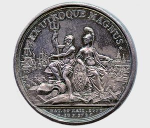 Η παράσταση της Αθηνάς και του Ποσειδώνα δεν αποτελεί αναφορά στον αρχαίο μύθο της διεκδίκησης της αττικής γης από τους δύο θεούς, αλλά συμβολίζει την κυριαρχία του Μεγάλου Πέτρου σε ξηρά και θάλασσα. Ρωσικής Αυτοκρατορίας, αργυρό μετάλλιο στο όνομα του Μεγάλου Πέτρου, 1672-1725. Νομισματικό Μουσείο, Συλ. Ζωσιμά.