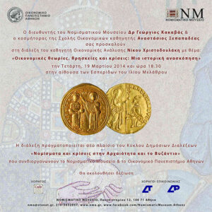 Το Νομισματικό Μουσείο σε συνεργασία με το Οικονομικό Πανεπιστήμιο Αθηνών διοργανώνουν για την Άνοιξη του 2014 Κύκλο Δημόσιων Διαλέξεων με θέμα «Νομίσματα και κρίσεις στην Αρχαιότητα και το Βυζάντιο».