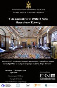Το Επιγραφικό και Νομισματικό Μουσείο σε συνεργασία με το Ελληνικό Ινστιτούτο Πολιτιστικής Διπλωματίας διοργανώνει συζήτηση μεταξύ του καθηγητή της Γεωπολιτικής και Πολιτισμικής Γεωγραφίας και Χωροταξίας Πανεπιστημίου Σορβόννης-Paris 1 κ. Γεωργίου Πρεβελάκη και του Προέδρου του Ελληνικού Ινστιτούτου Πολιτιστικής Διπλωματίας κ. Πέτρου Καψάσκη στο πλαίσιο της εκστρατείας του Ινστιτούτου με σκοπό τη δημιουργία διαύλου επικοινωνίας μεταξύ των σύγχρονων Ελλήνων στοχαστών και της νέας γενιάς.