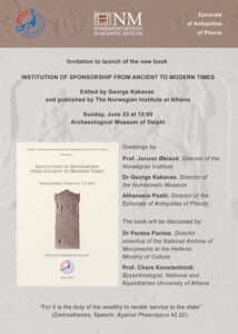 Την Κυριακή 23 Ιουνίου και ώρα 12:00 στο Αρχαιολογικό Μουσείο Δελφών θα πραγματοποιηθεί η παρουσίαση του τόμου των Πρακτικών του Συνεδρίου Institution of Sponsorship from Ancient to Modern Times. Θα απευθύνουν χαιρετισμό η Prof. Jorunn Økland, Διευθύντρια του Νορβηγικού Ινστιτούτου, ο Δρ Γεώργιος Κακαβάς, Διευθυντής του Νομισματικού Μουσείου και η Αθανασία Ψάλτη, Προϊσταμένη της Εφορείας Αρχαιοτήτων Φωκίδος. Για τον τόμο των Πρακτικών θα μιλήσουν ο Δρ Πάντος Πάντος, Επίτιμος Διευθυντής του Εθνικού Αρχείου Μνημείων του Υπουργείου Πολιτισμού και η Καθ. Χαρά Κωνσταντινίδη, Βυζαντινολόγος, Εθνικό και Καποδιστριακό Πανεπιστήμιο Αθηνών.