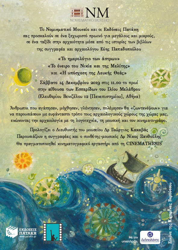 Παρουσίαση της σειράς βιβλίων της αρχαιολόγου Eύης Παπαδοπούλου με τίτλο «Το ημερολόγιο των άστρων», Το όνειρο του Νικία και της Μελίτης και Η υπόσχεση της Λευκής Θεάς» των εκδόσεων ΠΑΤΑΚΗ.