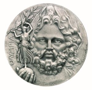 Το μετάλλιο των νικητών των πρώτων Διεθνών Ολυμπιακών Αγώνων στην Αθήνα το 1896 φιλοτέχνησε ο Γάλλος χαράκτης Jules-Clément Chaplain. Σε αυτό απεικονίζεται ο Δίας να κρατά σφαίρα επάνω στην οποία στέκεται μία Νίκη κρατώντας κλαδί ελιάς (Εικ.2). Η παράσταση ήταν εμπνευσμένη από το λατρευτικό άγαλμα που φιλοτέχνησε ο Φειδίας για το ναό της Ολυμπίας. Η Νίκη – η προσωποποίηση της Ελλάδας ή της Αναβίωσης των αρχαίων Ολυμπιακών Αγώνων κατά άλλες εκδοχές – απεικονίζεται και στο χρυσό αναμνηστικό μετάλλιο των πρώτων Ολυμπιακών Αγώνων (Εικ. 3), το οποίο φιλοτέχνησε ο ζωγράφος Νικηφόρος Λύτρας. Την παράσταση συνοδεύει το μυθικό πτηνό Φοίνικας, σύμβολο της αναγέννησης.