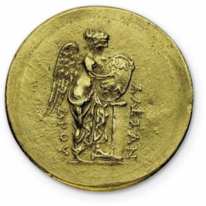 Η σύνδεση των μεταλλίων με τις αθλητικές εκδηλώσεις έχει μακρά ιστορία. Ανάμεσα στους προάγγελους των σύγχρονων Ολυμπιακών μεταλλίων ξεχωρίζουν τα χρυσά «νικητήρια» που απονέμονταν ως βραβεία στους οικουμενικούς αγώνες Ολύμπια Αλεξάνδρεια της Βέροιας κατά τον 3ο αιώνα μ.Χ. Έχουν εντοπιστεί σε θησαυρούς στο Αμπουκίρ της Αιγύπτου και στην Ταρσό της Κιλικίας. Ένα «μετάλλιο» αυτού του τύπου που εκτίθεται στην Αίθουσα των Μεταλλίων του Νομισματικού Μουσείου απεικονίζει την Νίκη να χαράσσει επιγραφή σε ασπίδα (Εικ. 1).