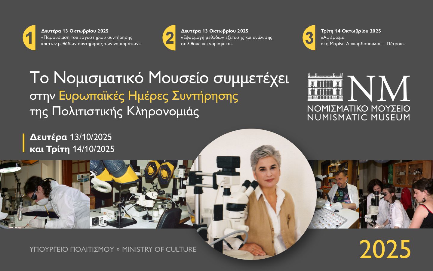 Γιορτάζοντας τις Ευρωπαϊκές Ημέρες Συντήρησης της Πολιτιστικής Κληρονομιάς1, το Νομισματικό Μουσείο διοργανώνει για άλλη μια χρονιά εκδηλώσεις και δραστηριότητες που απευθύνονται στο ευρύ κοινό, σε επαγγελματίες της συντήρησης και όχι μόνο, ανοίγοντας τις πόρτες του εργαστηρίου συντήρησης για δύο ημέρες.