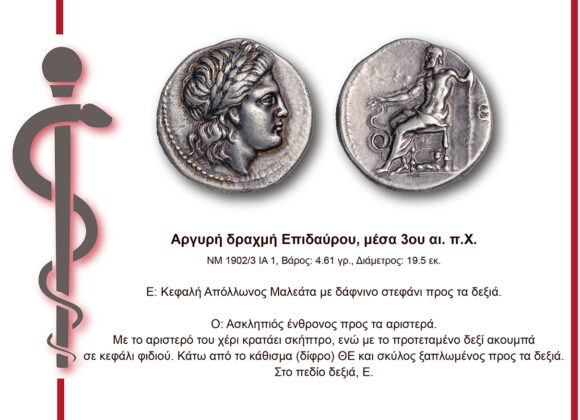 Here we present a silver drachma from Epidaurus that was issued in the mid-3rd century BC and is housed in a display case on the first floor of the Museum. It depicts on the reverse the gold and ivory statue of Asclepius, god of health and medicine, which was crafted by Thrasymedes and was placed in the temple of ancient Epidaurus. The rendering of the statue is in harmony with the description of Pausanias (II, 27.2):