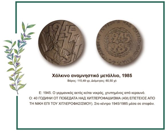In the context of the anniversary, we present a bronze commemorative medal, which is exhibited in a display case on the second floor of the Numismatic Museum and was issued in 1985 on the occasion of the 40th anniversary of the victory of the Union of Soviet Socialist Republics (USSR) over the Axis powers and the end of World War II.